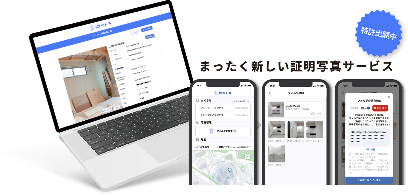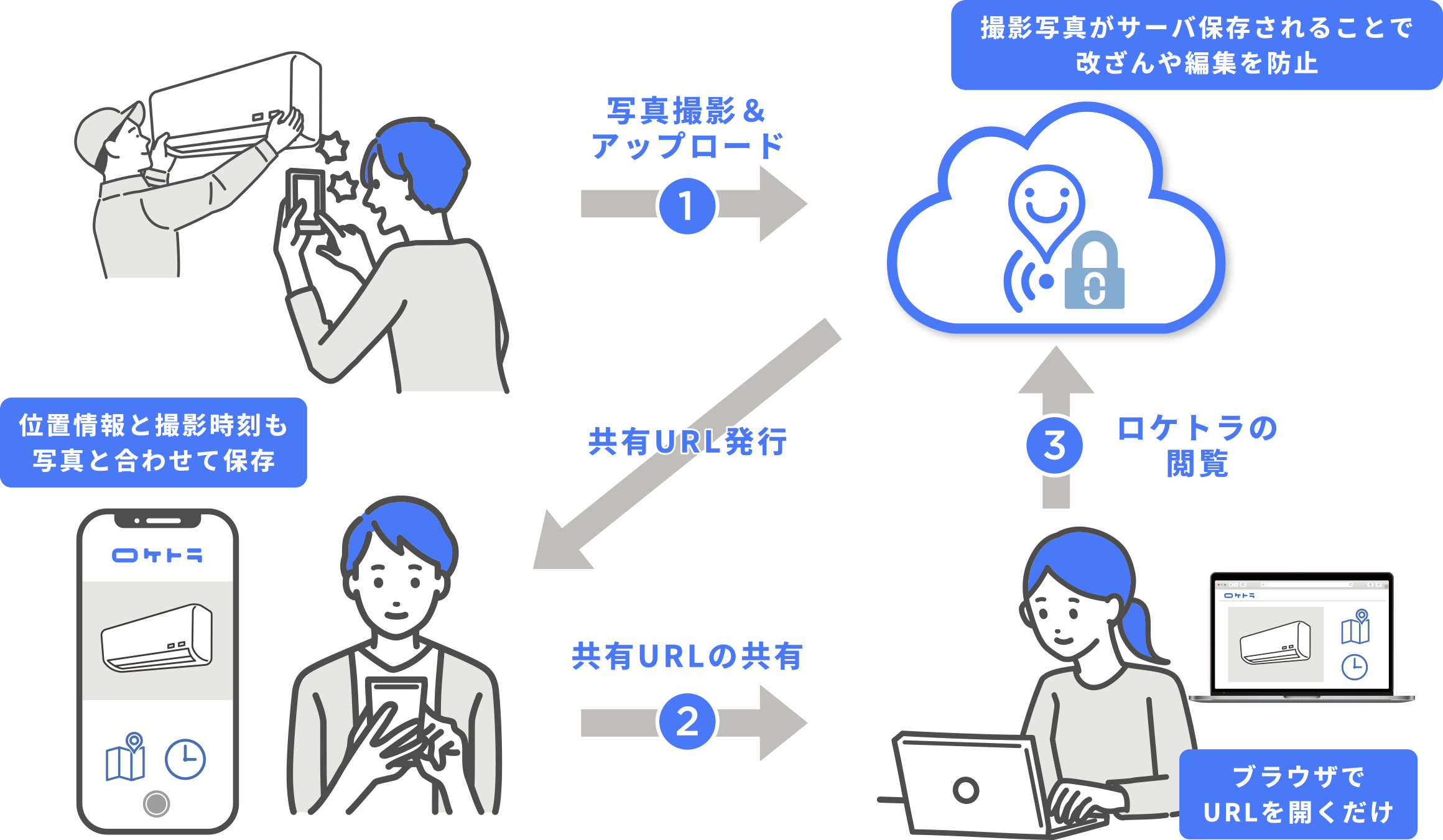 工事や設置の記録写真を撮影したいけれど、高額な導入費用がネック。ロケトラでは、写真・日時・GPS情報を改ざん困難なサーバにアップロードするため、工事・設置証明の一助となることができます。