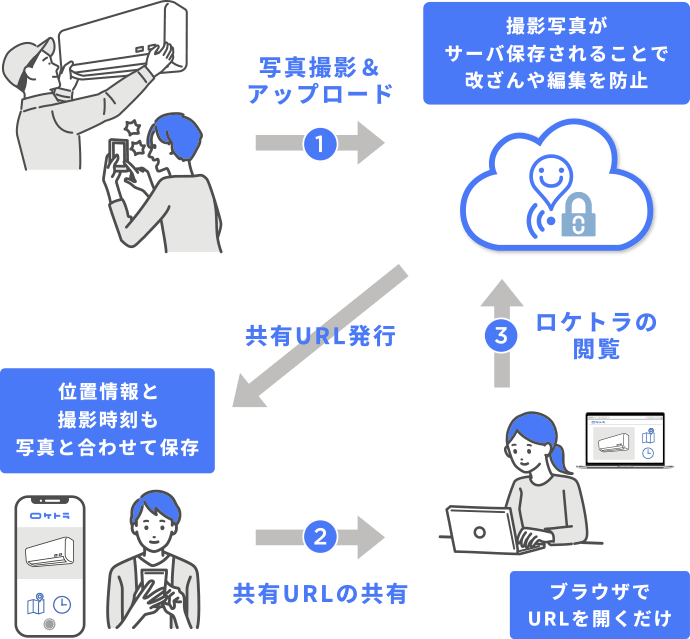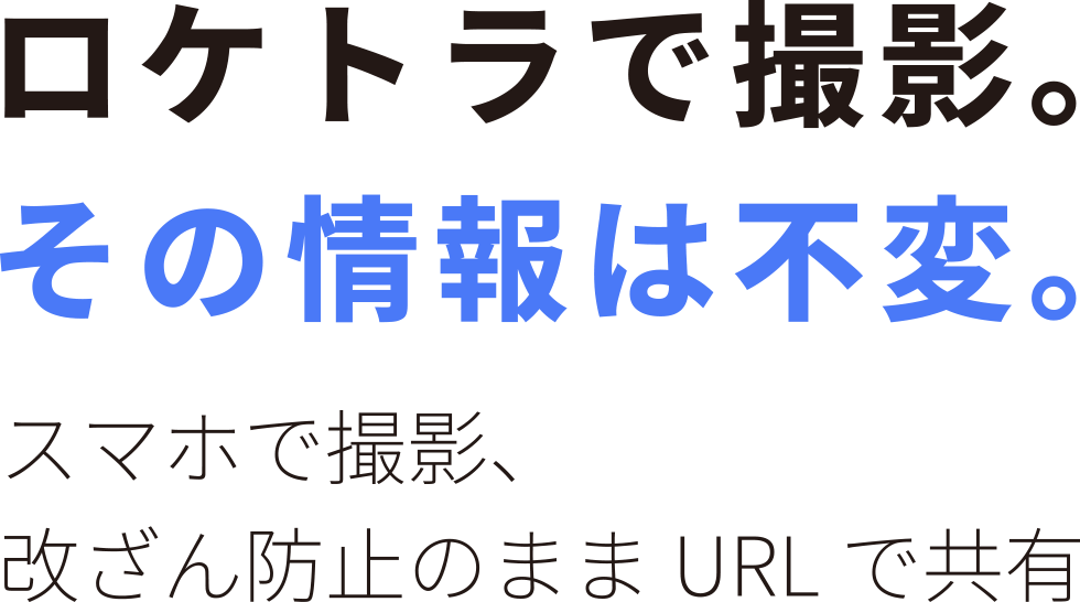 アプリで撮影された写真は、位置情報等のロケーション情報と一緒にクラウドに保存されます。編集や加工ができないため、データが改ざんされる可能性を大きく下げることができます。